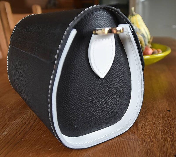 Son design élégant mêle le caractère du cuir caviar noir grainé à la pureté du cuir de vachette blanc.